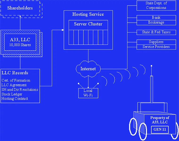 Instead of a corporation, we may use a business trust or limited liability company (LLC) for more flexible legal drafting. The managers may have a duty to keep the entity’s mental state current, to preserve its value. Parties contributing significant intellectual property, such as capability or personality modules, may receive equity.