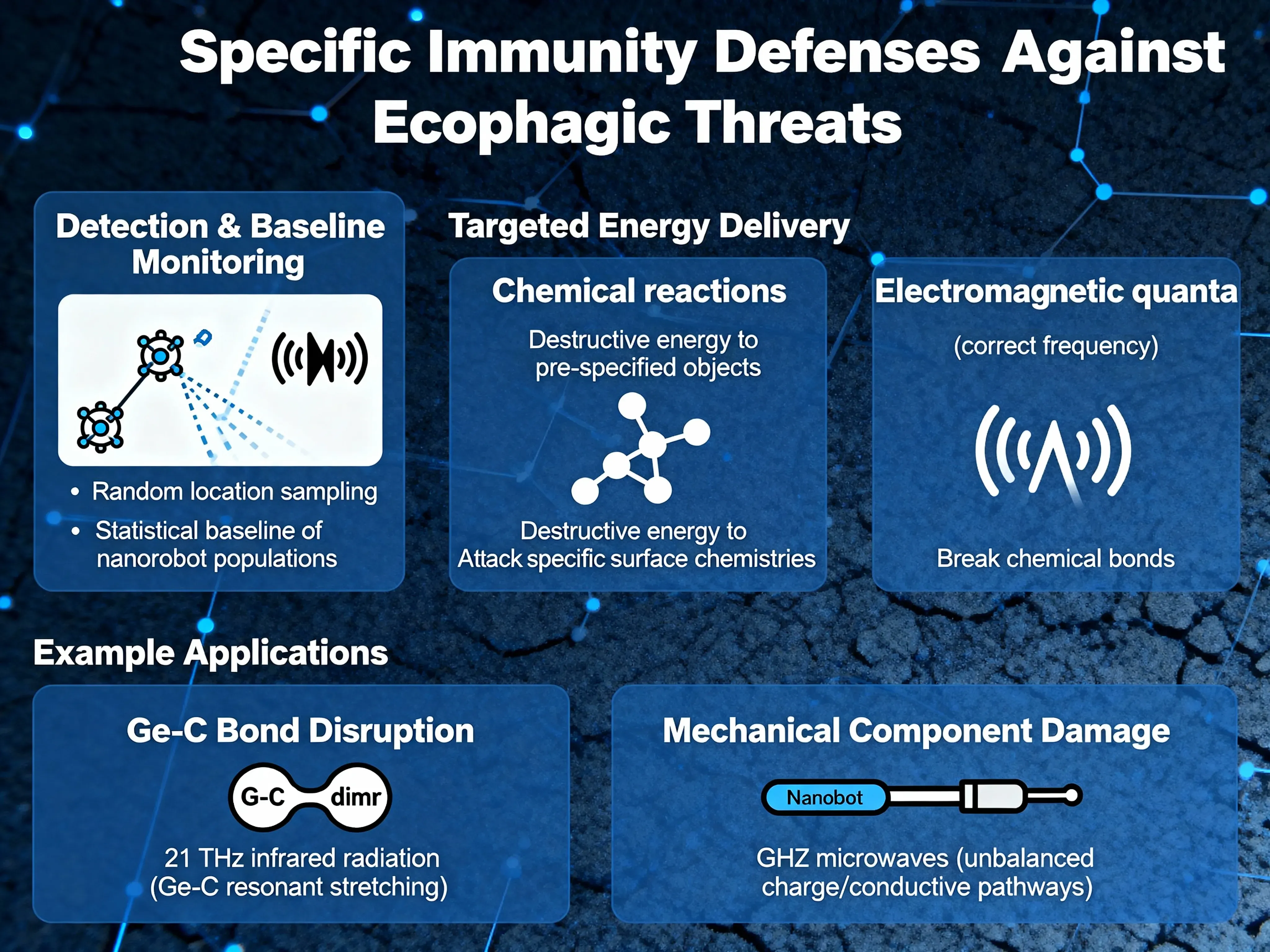 If ecophages are detected, there could be a response from prepositioned stores of generic defensive nanorobots manufactured by a global network of defensive nanofactory stations that have been put in place well in advance of the outbreak of the threat. These first-line defensive nanorobots will have generic abilities to disable ecophages — e.g., sensor blinding, spray painting to ruin energy-producing solar cells, and perhaps some capability of mechanical disassembly or physical crushing, electric shock, e-beam irradiation, and so forth. These defenses will buy time for the specific immunity defenses to kick in.