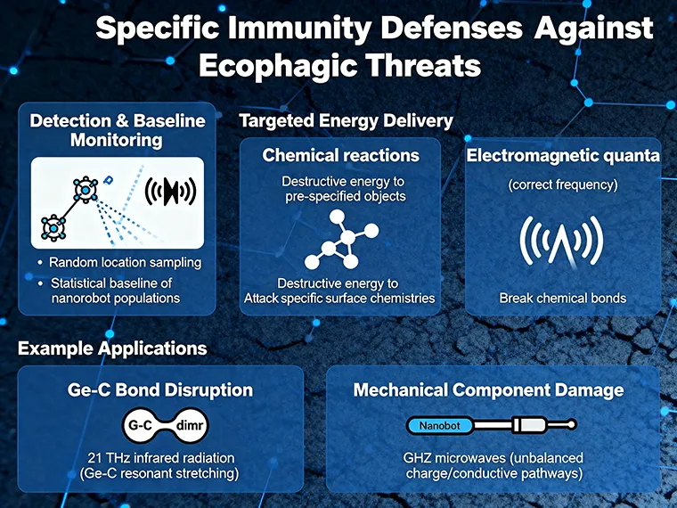 A second set of instrumentalities that should be put in place comprise a specific, targeted immunity response to a perceived ecophagic threat. These defenses would be designed to attack the particular ecophage in question. They could not be launched until the ecophage was identified and its weaknesses determined. A regular program of collecting and inspecting nanorobots found in the environment via sampling from randomly selected locations would help to establish a statistical baseline on extant nanorobot populations and would also provide an early warning of new nanorobotic capabilities that are being fielded.