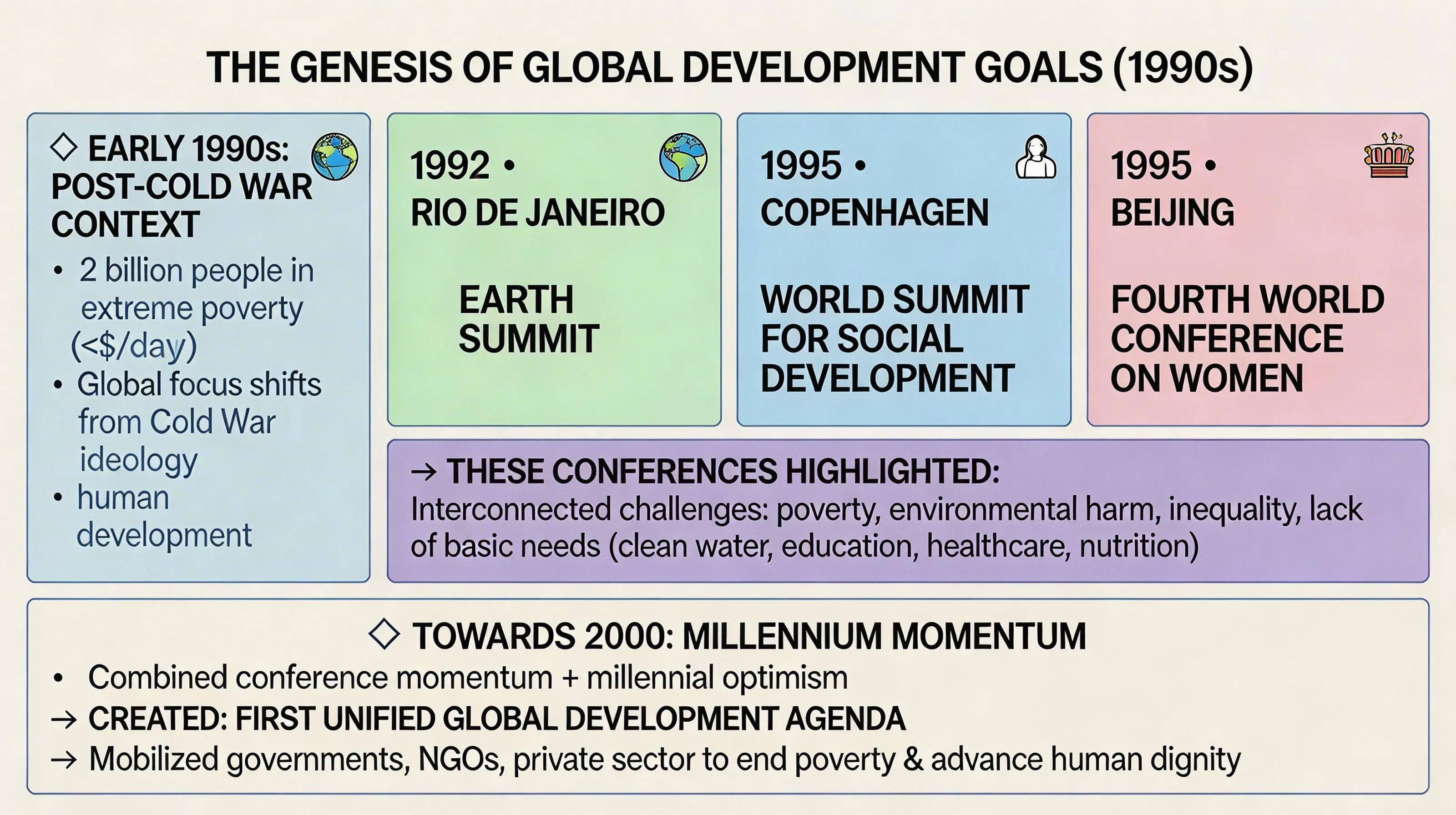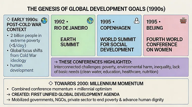 The closing decade of the twentieth century witnessed an unprecedented convergence of global consciousness regarding human development. Following the end of the Cold War, the international community found itself at a critical juncture where the ideological battles that had dominated geopolitics for half a century gave way to a renewed focus on addressing the fundamental challenges facing humanity. The 1990s were marked by stark disparities in wealth, health, and opportunity across nations, with almost 2 billion people living in extreme poverty, surviving on less than one dollar per day.