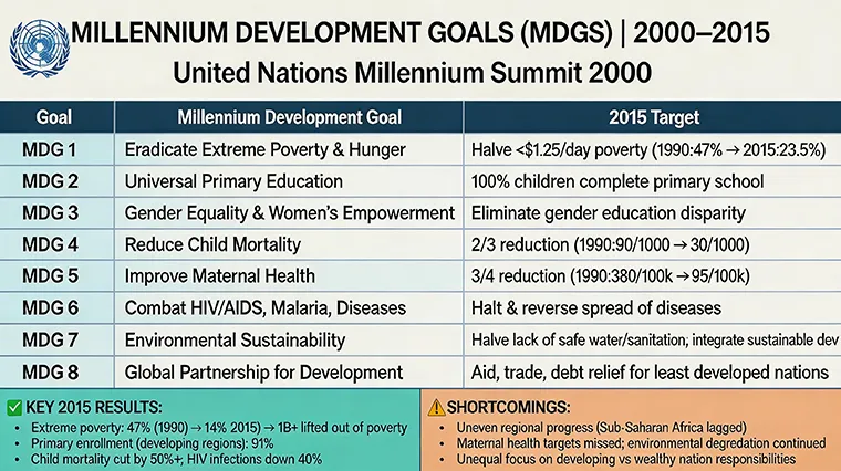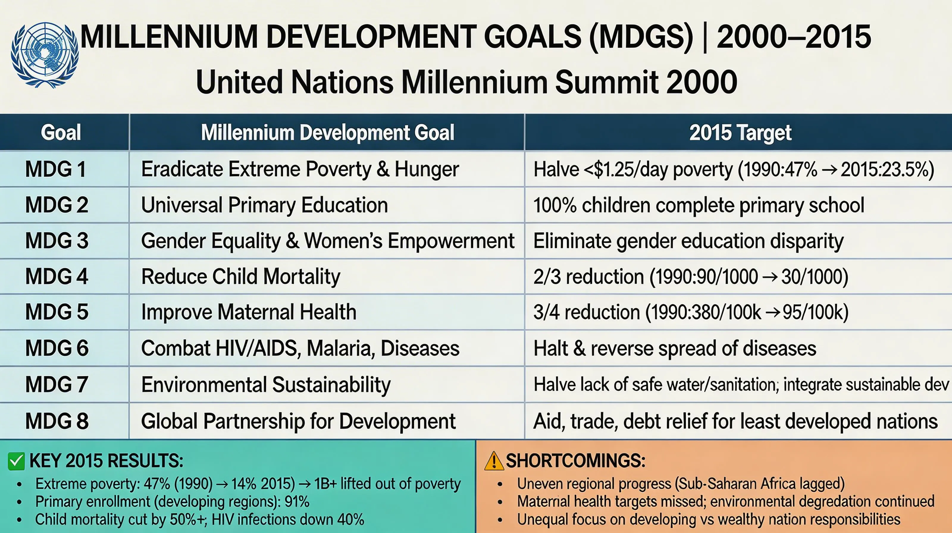 In September 2000, world leaders gathered at the United Nations Millennium Summit and adopted the Millennium Declaration, which gave birth to the Millennium Development Goals. These eight goals represented a historic commitment by 189 member states to combat poverty, hunger, disease, illiteracy, environmental degradation, and discrimination against women. The MDGs established 2015 as the target year for achievement and provided a framework with specific, measurable indicators that enabled progress tracking across countries and regions.