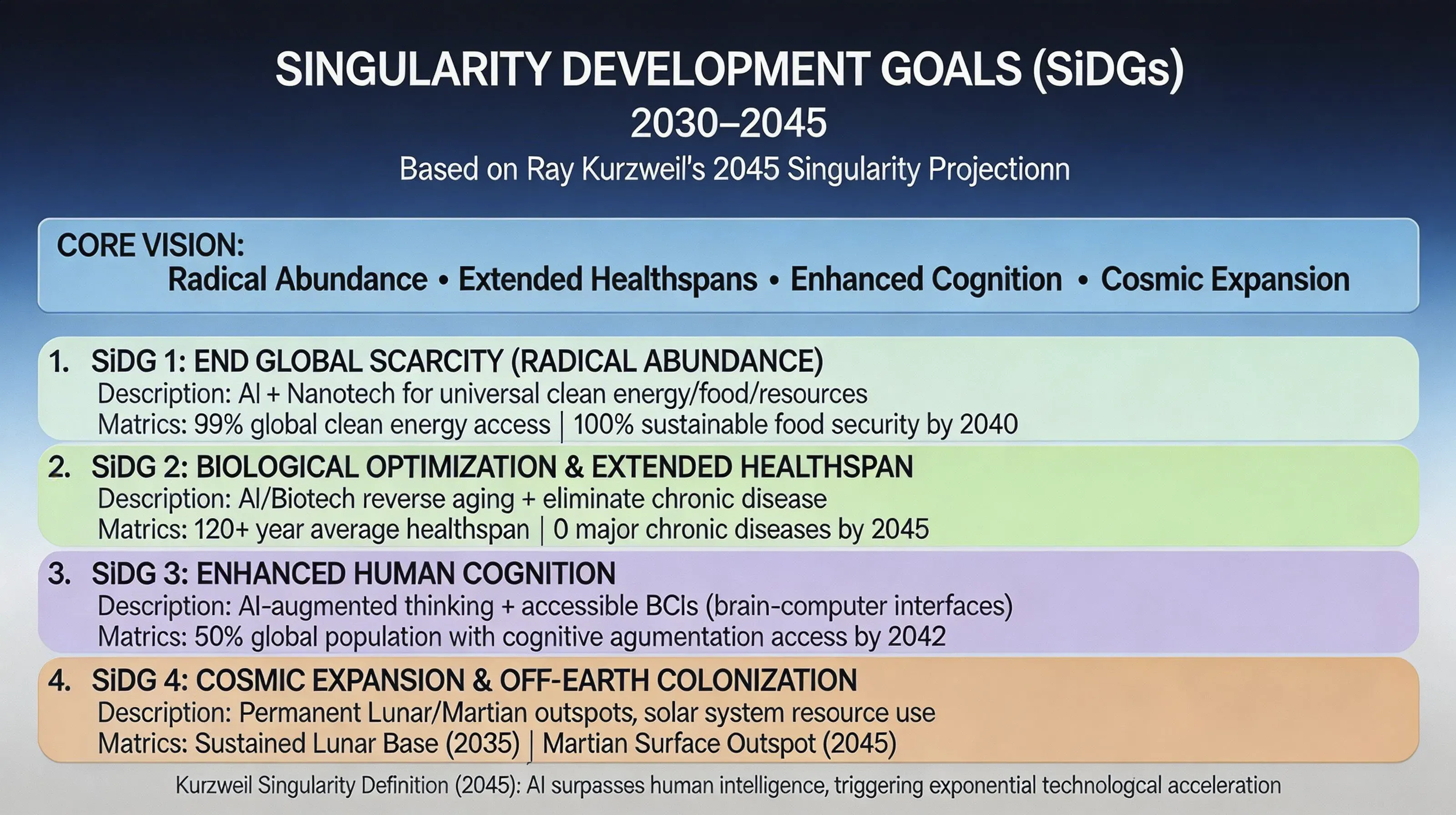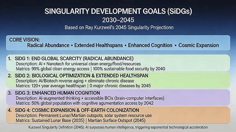 As we stand on the cusp of what technologist and futurist Ray Kurzweil has termed “the Singularity”—a projected point around 2045 when artificial intelligence will surpass human intelligence and trigger unprecedented technological acceleration—it becomes imperative to reimagine our development framework for this transformative era. The Singularity Development Goals represent a bold vision for humanity’s evolution beyond the constraints of twentieth-century thinking into a future characterized by radical abundance, extended healthspans, enhanced cognition, and cosmic expansion by 2045, the expected date of the “Singularity” according to Ray Kurzweil.